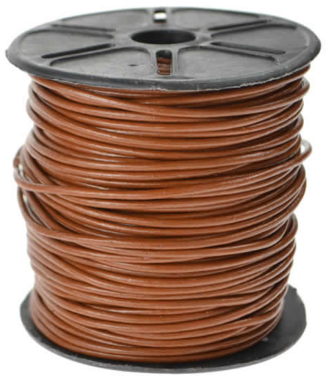 Thin rolled leather lace round profile - 2mm diameter. Colour: Light brown with a high gloss finish. Minimum order 1 spool of 50m.Note: Round leather laces are a decorative lace - they are not as strong as cut leather or man made laces.