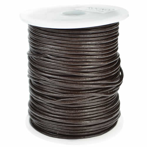 Thin rolled leather lace round profile - 2mm diameter. Colour: Polished dark brown with a shiny finish. Minimum order 1 spool of 50m.Note: Round leather laces are a decorative lace - they are not as strong as cut leather or man made laces.